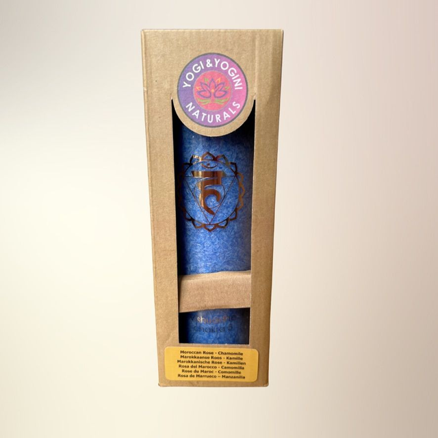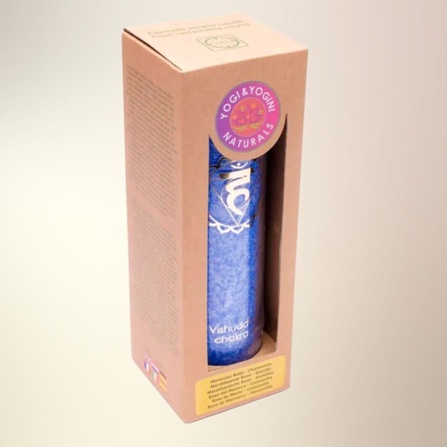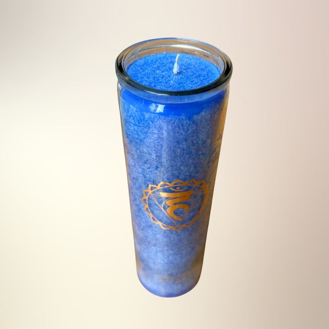 Dette håndstøbte stearinlys er dedikeret til Vishuddha (halschakraet), som repræsenterer kommunikation, udtryk og indre sandhed. Lyset er farvet i blide blå nuancer og tilsat en subtil duft, der understøtter klarhed og energetisk balance i tale og kreativt udtryk.