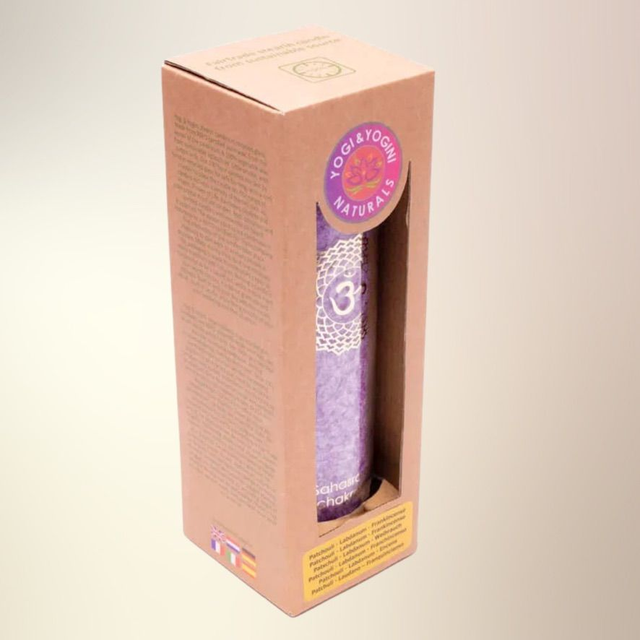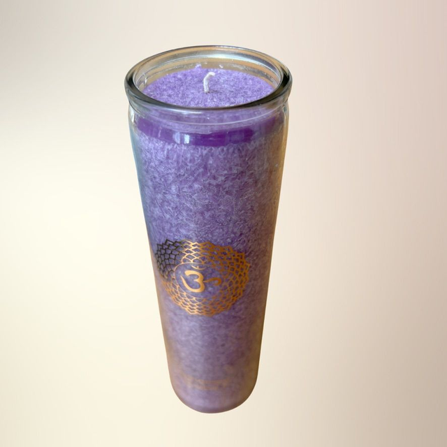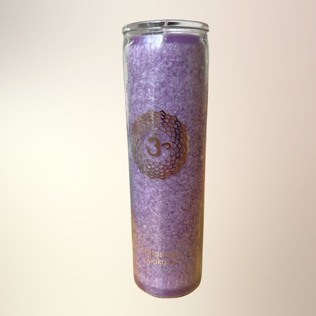 Dette håndstøbte stearinlys er dedikeret til Sahasrara (kronechakraet), som repræsenterer spirituel forbindelse, bevidsthed og indre lys. Lyset er farvet i blide violette nuancer og tilsat en subtil duft, der støtter meditation, stilhed og kontakt med det højere selv.
