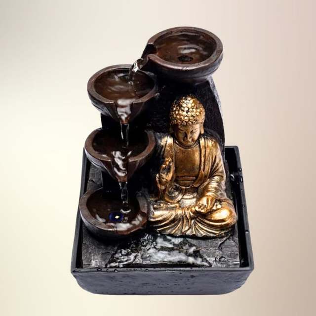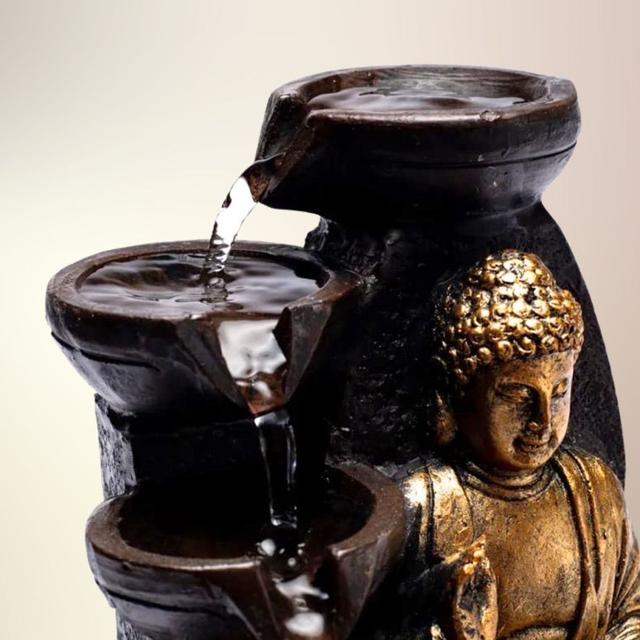 Denne stemningsfulde bordfontæne forener visuel ro med spirituel dybde. Den mediterende Buddha udstråler medfølelse og indre fred, mens vandet risler blidt omkring ham – en invitation til nærvær, healing og kontemplation.