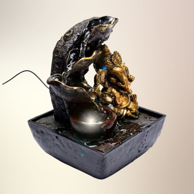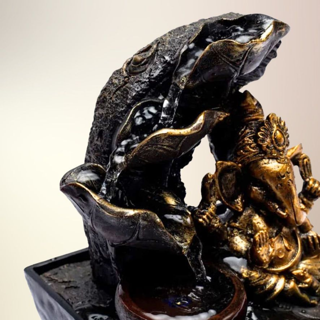 Denne stemningsfulde bordfontæne forener spirituel symbolik med sanselig ro. Ganesh – den indiske elefantgud – er kendt som fjerner af forhindringer og beskytter af nye begyndelser. Her ses han siddende i meditation, omgivet af rislende vand, som skaber en blid lyd og et fredfyldt energifelt.
