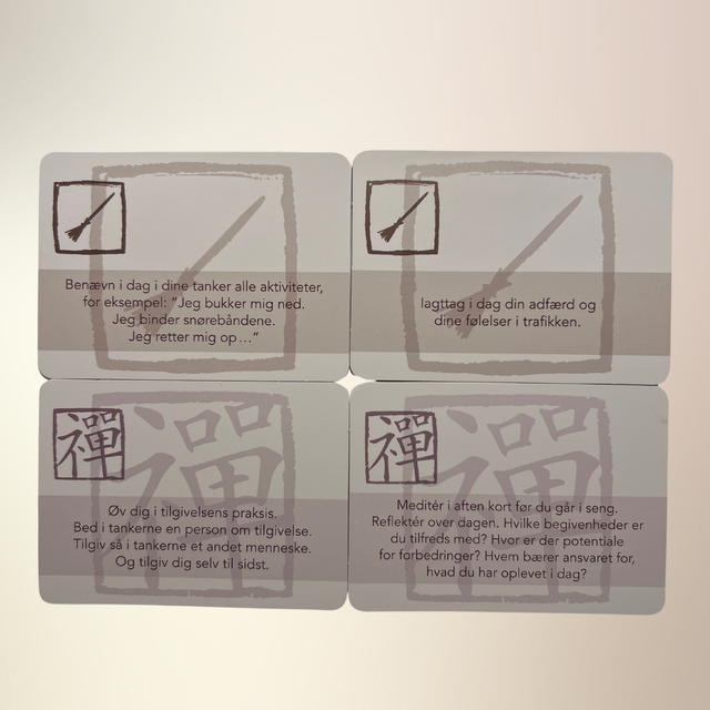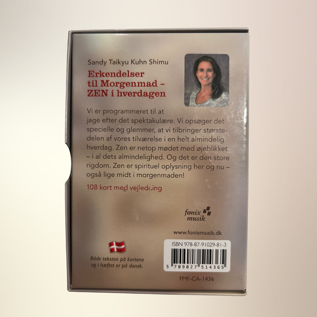 Et unikt kortsæt med 108 zen-inspirerede kort, der inviterer dig til at møde øjeblikket med nærvær, refleksion og enkelhed. Kortene formidler spirituel indsigt midt i det almindelige – som en stille morgenstund, en kop te eller et dybt åndedrag. De motiverer dig til at stille spørgsmål, erfare og opdage sandheden i din hverdag. Enkle, men dybtgående budskaber, der vækker ro og klarhed.