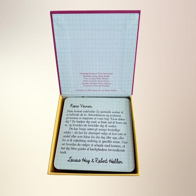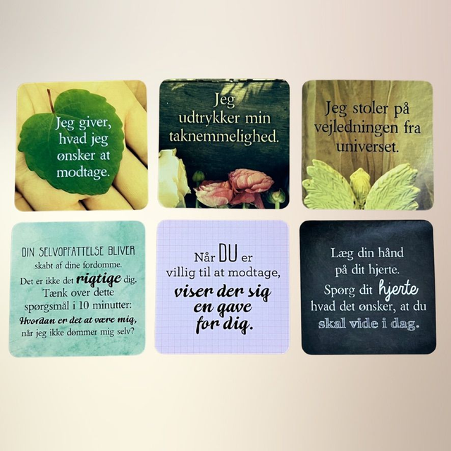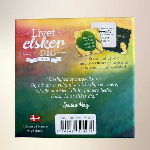 Dette kortsæt indeholder 52 smukt illustrerede kort med kærlige affirmationer og refleksioner, der hjælper dig med at åbne hjertet, styrke selvværdet og leve med større tillid til livet. Hvert kort rummer en positiv sætning på forsiden og en uddybende tekst på bagsiden – skabt til at støtte dig i din personlige og spirituelle udvikling.