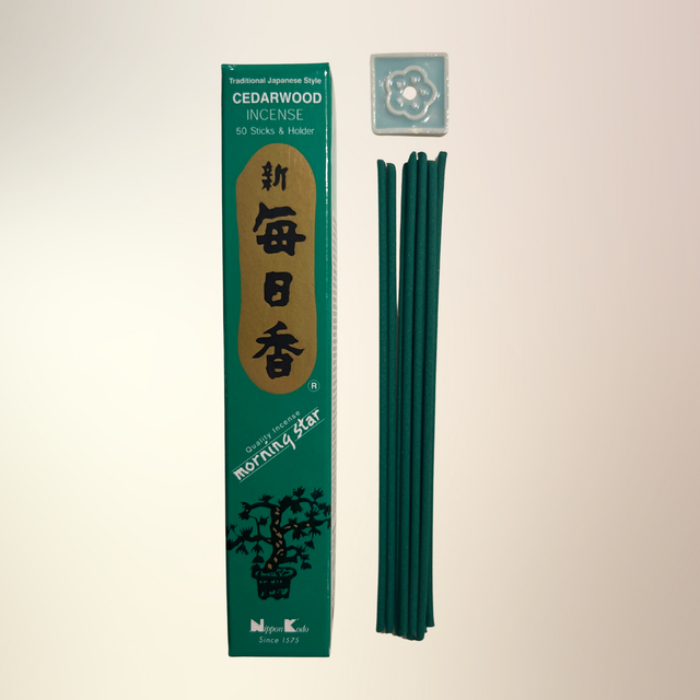 Morning Star Cedar Wood bringer en varm og tør træduft, der skaber en atmosfære af styrke, klarhed og jordforbindelse. Cedertræ forbindes med beskyttelse, visdom og stabilitet – og denne japanske røgelse egner sig særligt til energiarbejde, meditation og stunder med indre forankring. Duften er diskret og vedvarende, og giver en følelse af ro og struktur i rummet.