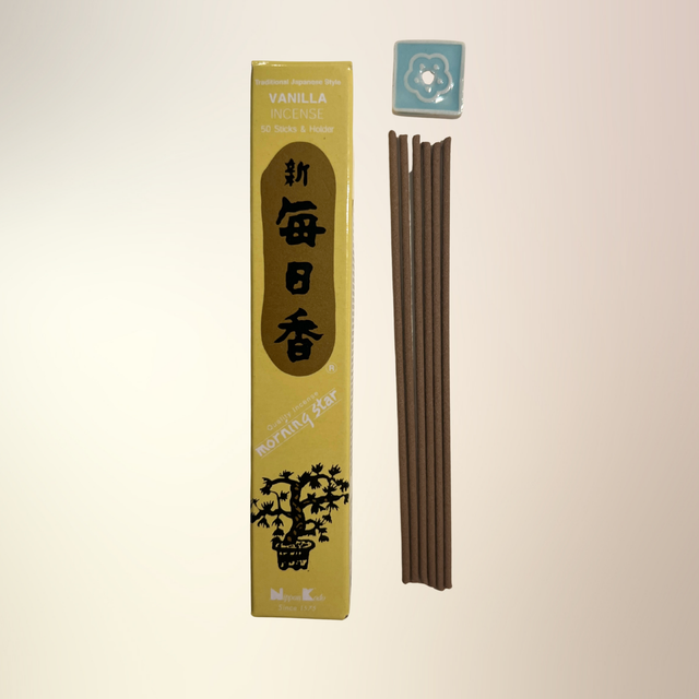 Morning Star Vanilla er en klassisk japansk røgelse med en mild og behagelig duft af vanilje, der skaber en atmosfære af varme, tryghed og afslapning. Den sødmefulde aroma er ideel til stunder med selvomsorg, meditation eller som en blid baggrundsduft i hjemmet. Morning Star er kendt for sin rene brænding uden bambuspind i midten, hvilket giver en rolig og klar duftoplevelse uden røgelsens typiske skarphed.