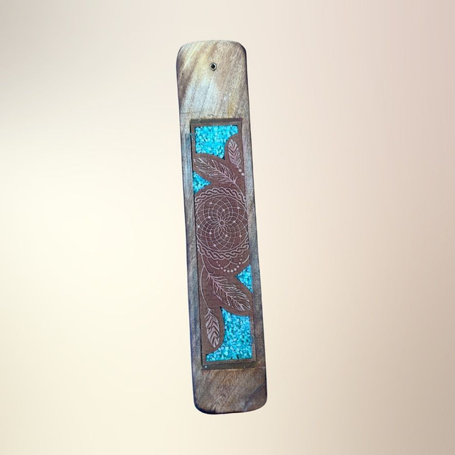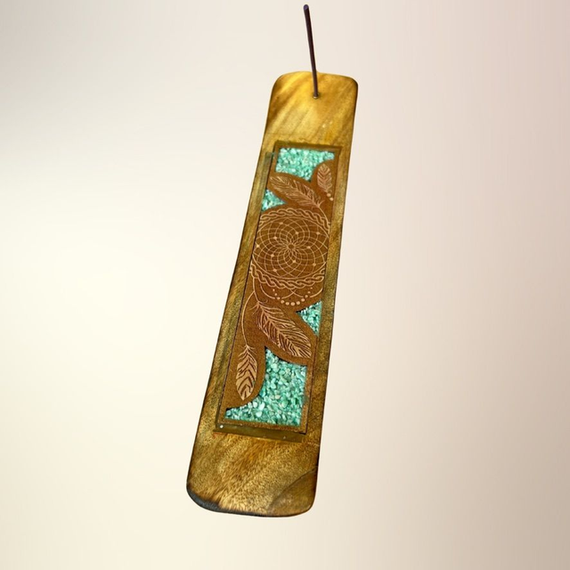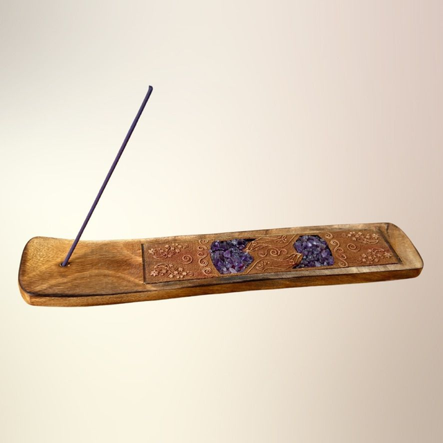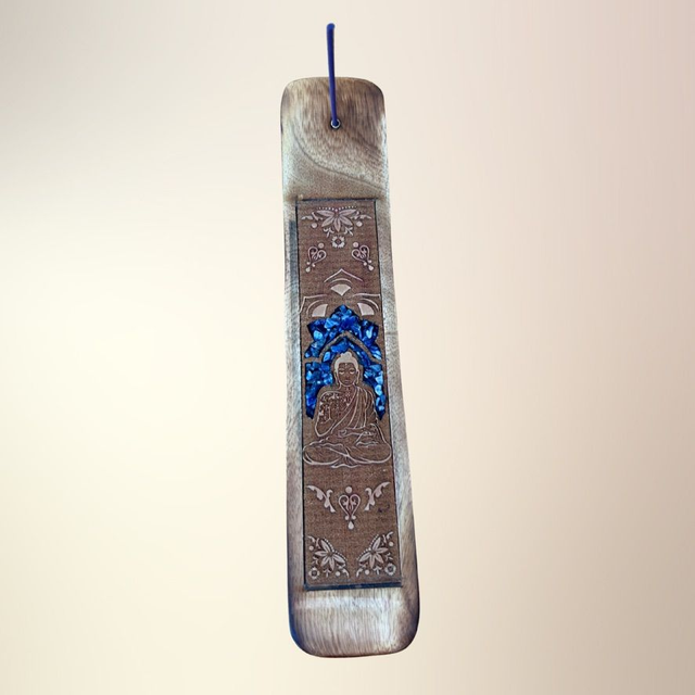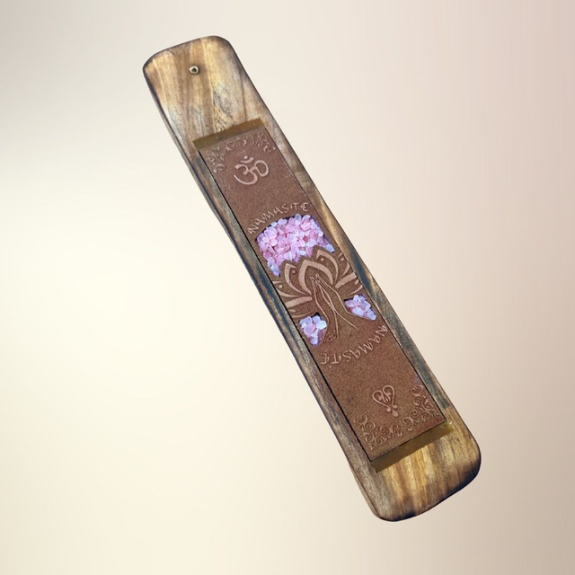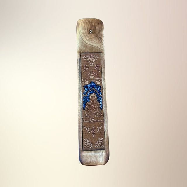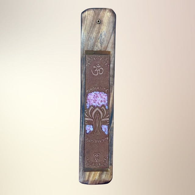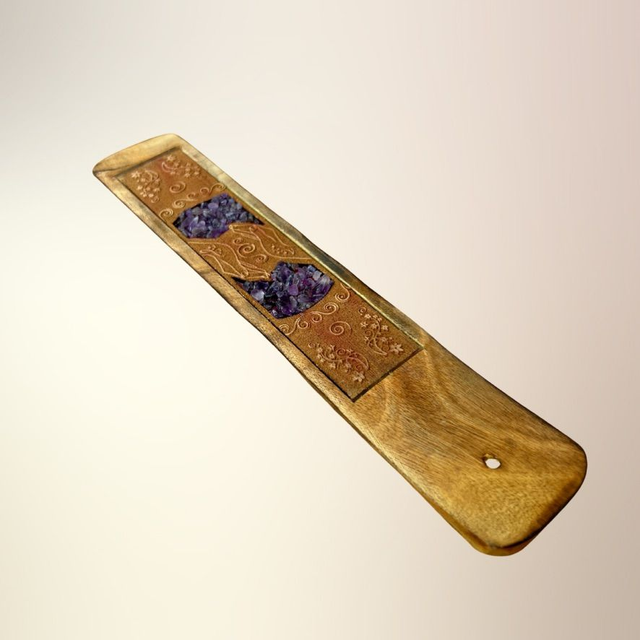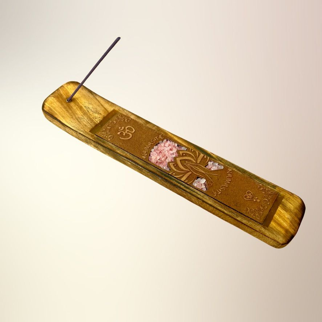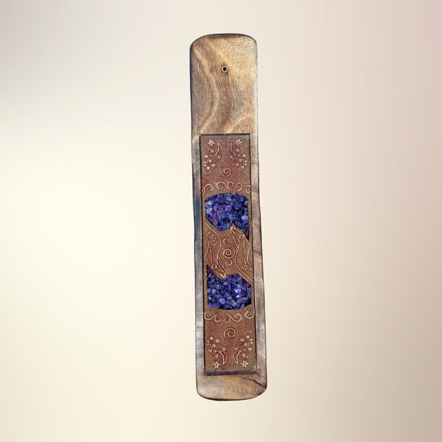 En dekorativ og funktionel røgelsesholder udskåret i træ og dekoreret med ægte krystalsten og spirituelle motiver som Buddha, Namasté, Healende hænder og Drømmefanger. Hver holder er designet til at forene røgelsesritualer med symbolsk dybde og krystallens energi – og skaber et sanseligt rum for ro, refleksion og spirituel praksis.