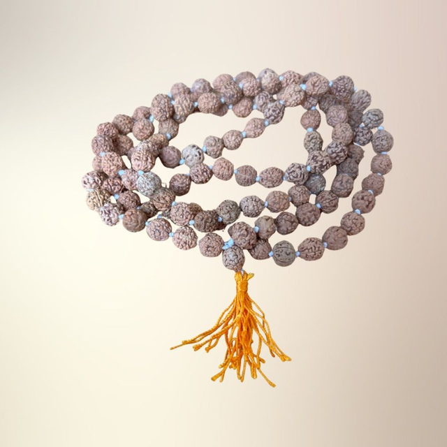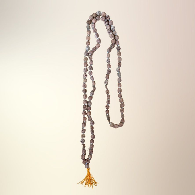 Denne traditionelle mala er håndlavet med 108 rudraksha-perler – hellige frø fra rudraksha-træet, som i hinduistisk og buddhistisk praksis forbindes med beskyttelse, klarhed og spirituel styrke. Den varme orange kvast symboliserer vitalitet og transformation, og tilfører et energisk udtryk til malaens naturlige jordtone.