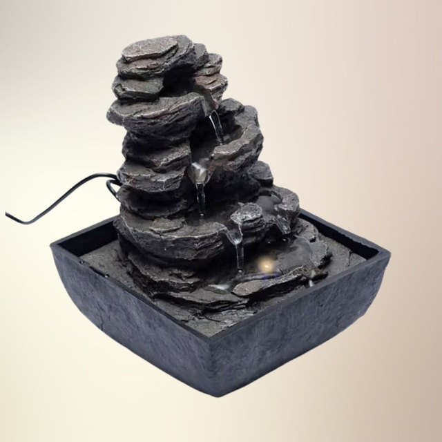 Denne kompakte bordfontæne bringer naturens blide strøm ind i dine rum. Designet i stengrå polyresin med et organisk klippeformet udtryk, skaber den en beroligende lyd af rislende vand – ideel til meditation, behandling, kontemplation eller som en sanselig dekoration i hjemmet.